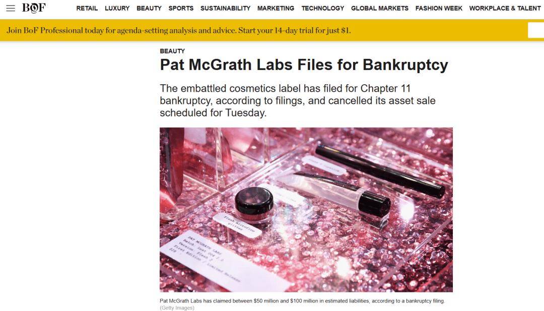 日前(1月26日),据外媒BOF相关报道显示,根据1月22日提交的一份请愿书显示,Pat McGrath Lbs已经在佛罗里达州南部地区申请了《美国破产法》第11章破产保护,并取消了原定于周二进行的资产出售。且破产申请后,这一进程被无限期推迟。